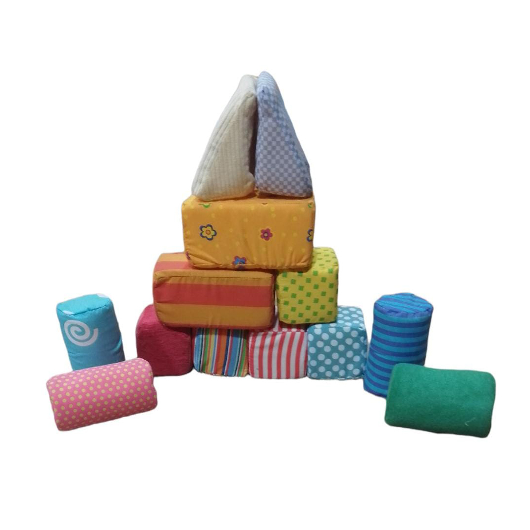 Set de 13 bloques de distintas texturas, formas tales como: 5 cuadrados, 2 rectángulos, 4 cilindros y 2 semi rectángulos, en colores llamativos. Material suave al tacto en género soft. Sus dimensiones son 8 x 15 x 8 cm. (pieza más grande, rectángulo) y 7. 5 cm x 7. 5 cm. (pieza más pequeña, cuadrado). Presentación en bolsa de plástico.