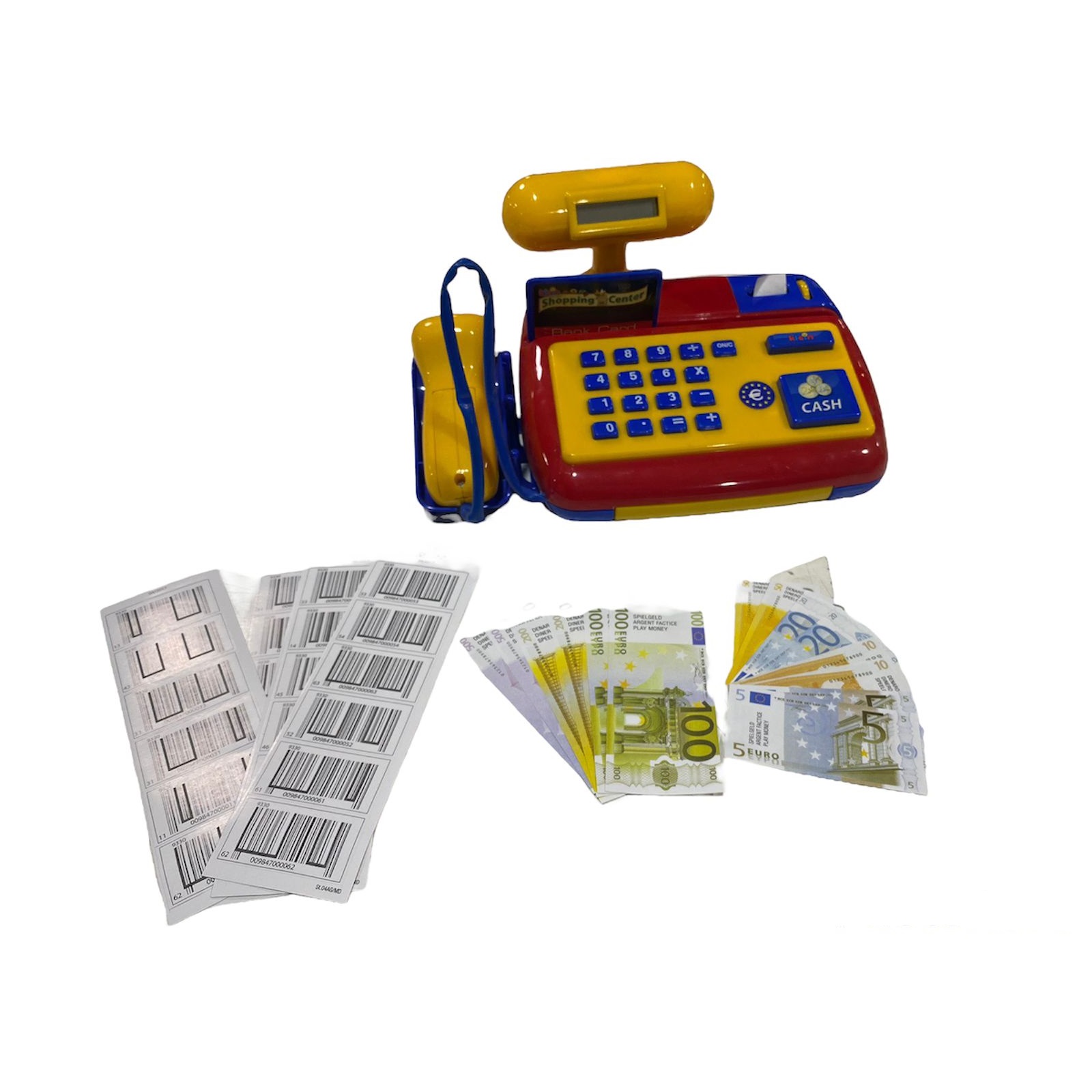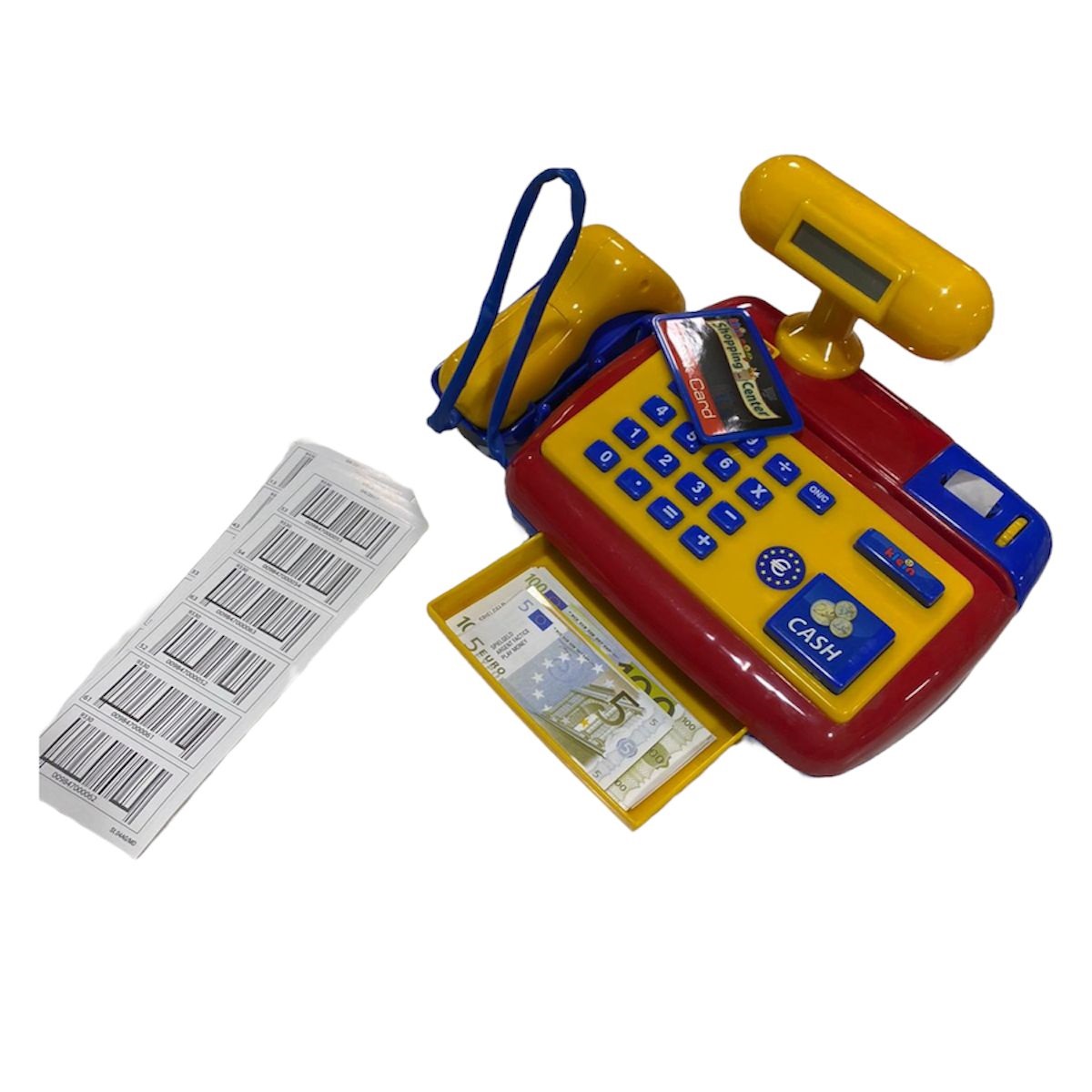 Desarrolla habilidades sociales: practica situaciones sociales en casa con este bonito registro de efectivo. Caja registradora a pilas con escáner real y función de calculadora – Con tarjeta de crédito y dispensador de papel – Con sonido al abrir la caja registradora y al pasar la tarjeta de crédito. Con numerosos accesorios: 24 códigos de barra, tarjeta y billetes que ayudan a desarrollar el conteo y calcular el cambio correcto. Funciona con 2 pilas AAA, que se insertan en el scanner. Material plástico de alta calidad. Dimensiones 26 x 17 x 14,5 cm. Presentación caja.