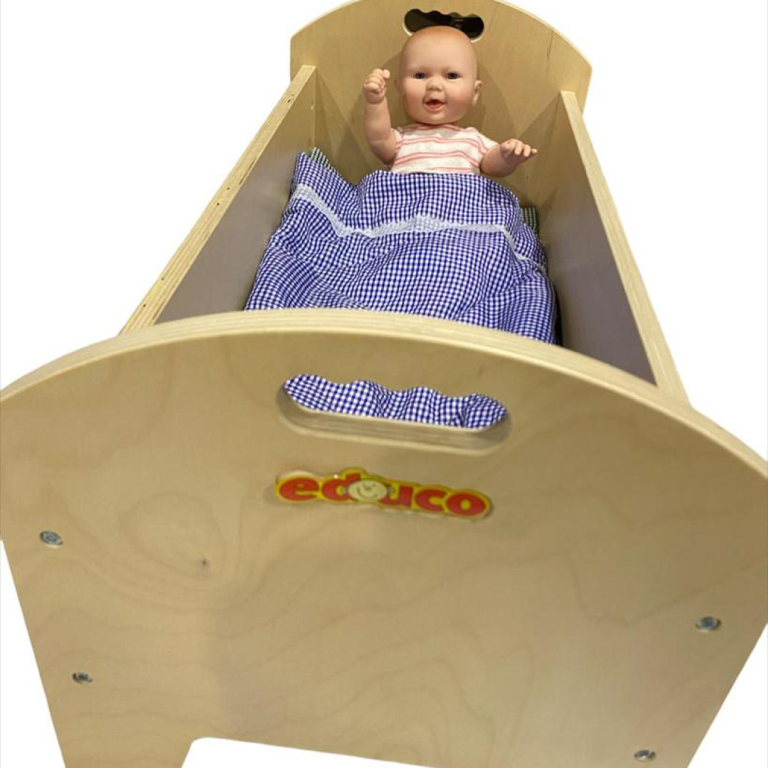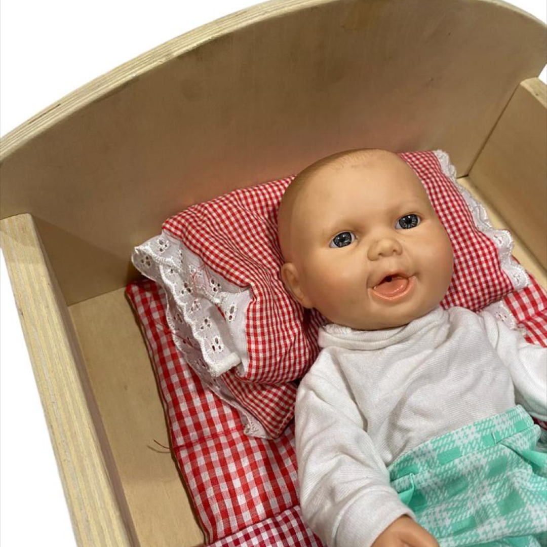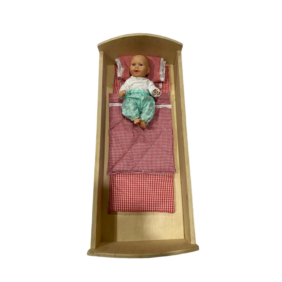 Cuna de madera con muñeco para desarrollar las habilidades sociales mediante el juego de roles, además de promover la creatividad e imaginación. Incluye ropa de cuna y muñeco sexuado de goma atóxica resistente y de buena calidad. Las dimensiones de la cuna se encuentran entre 31x63x37 cm y 25x73x33cm, muñeco de 30cm. Presentacion en bolsa.