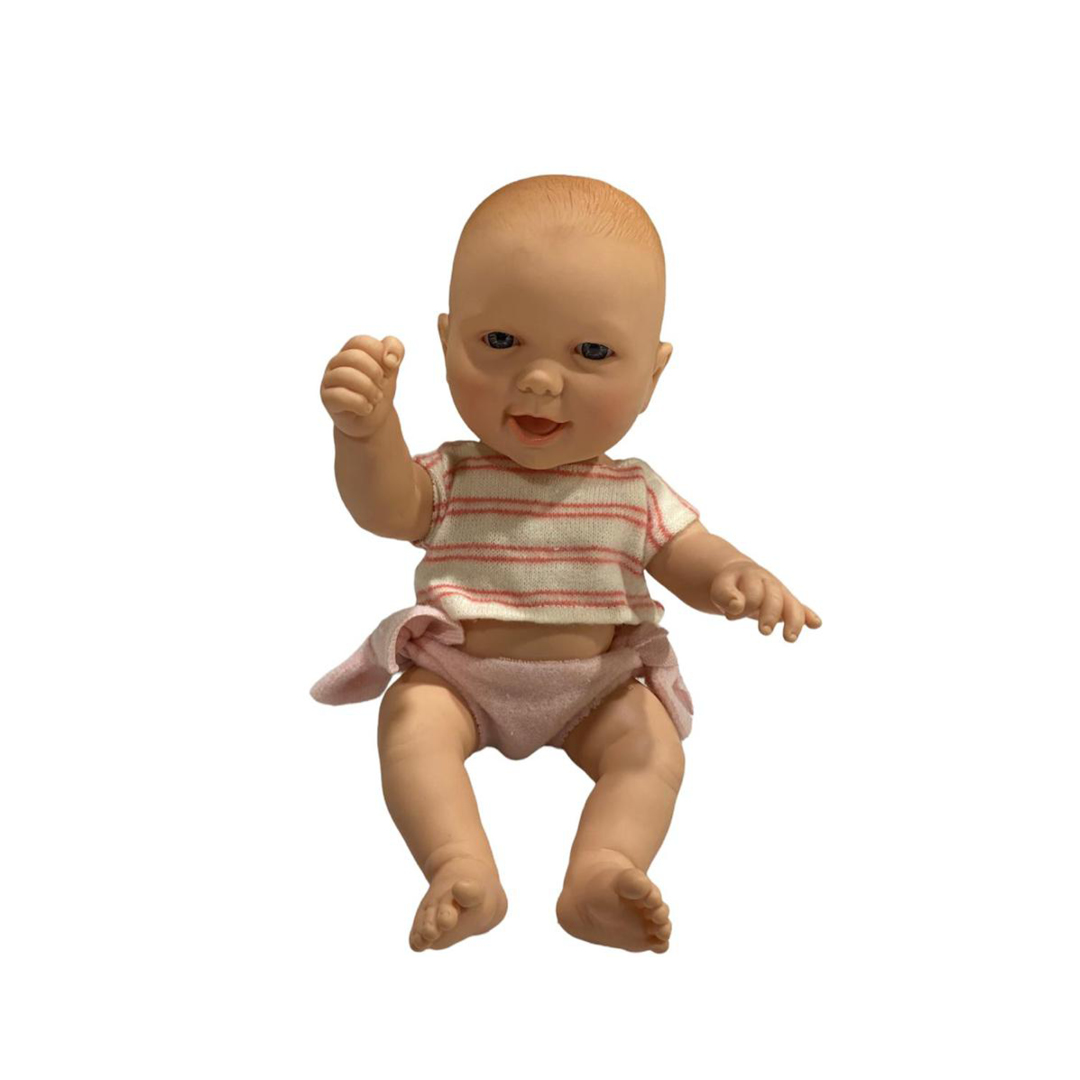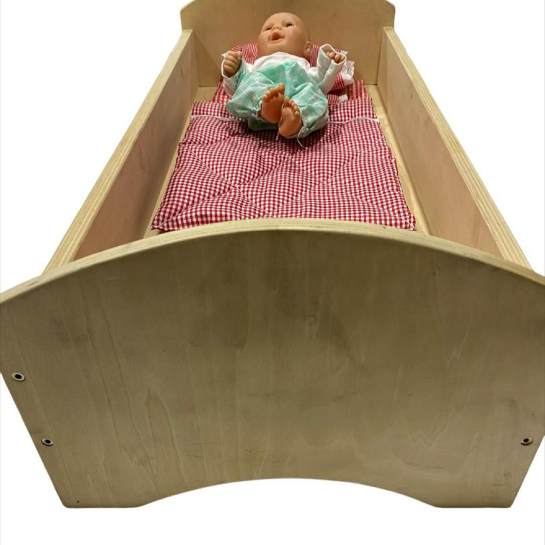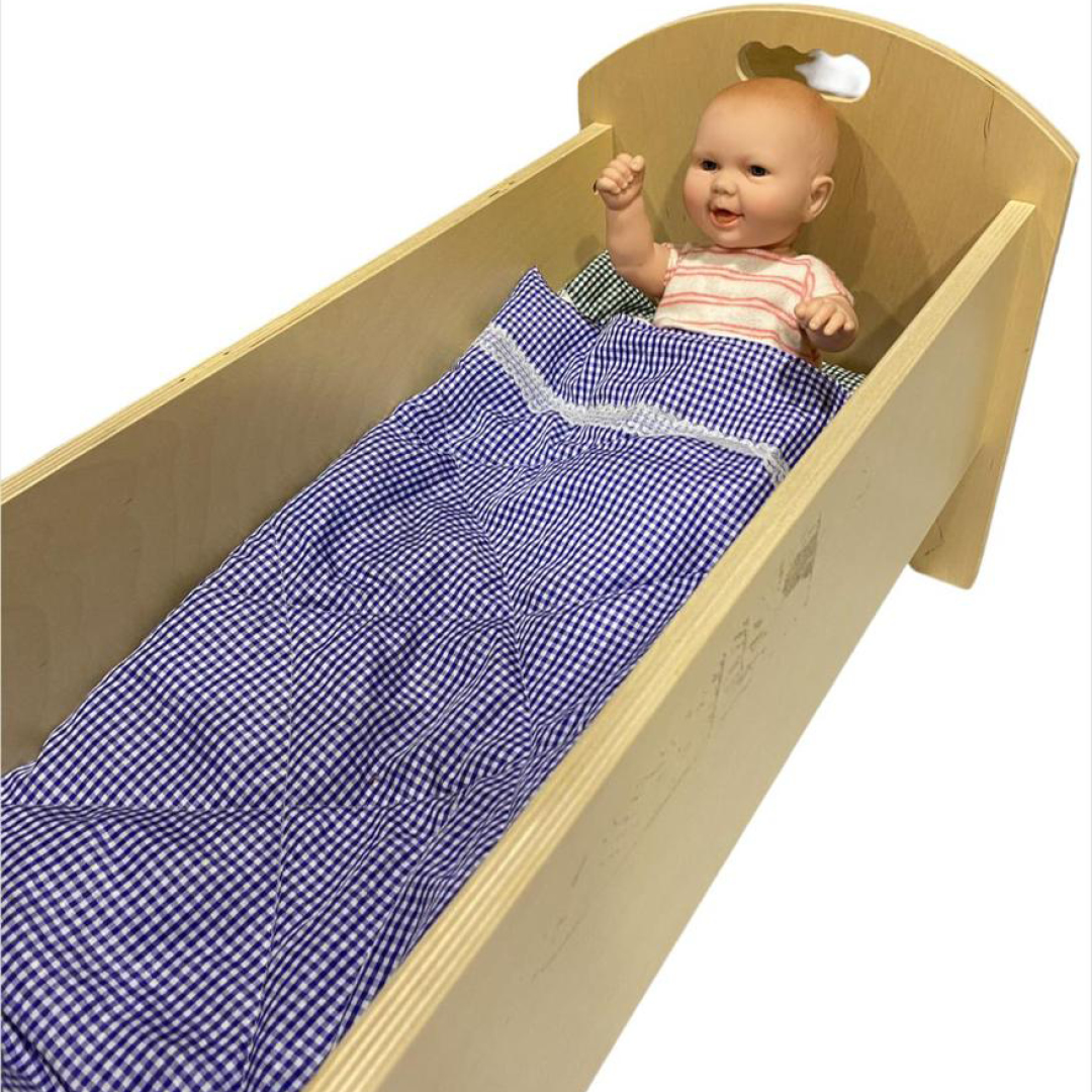 Cuna de madera con muñeco para desarrollar las habilidades sociales mediante el juego de roles, además de promover la creatividad e imaginación. Incluye ropa de cuna y muñeco sexuado de goma atóxica resistente y de buena calidad. Las dimensiones de la cuna se encuentran entre 31x63x37 cm y 25x73x33cm, muñeco de 30cm. Presentacion en bolsa.