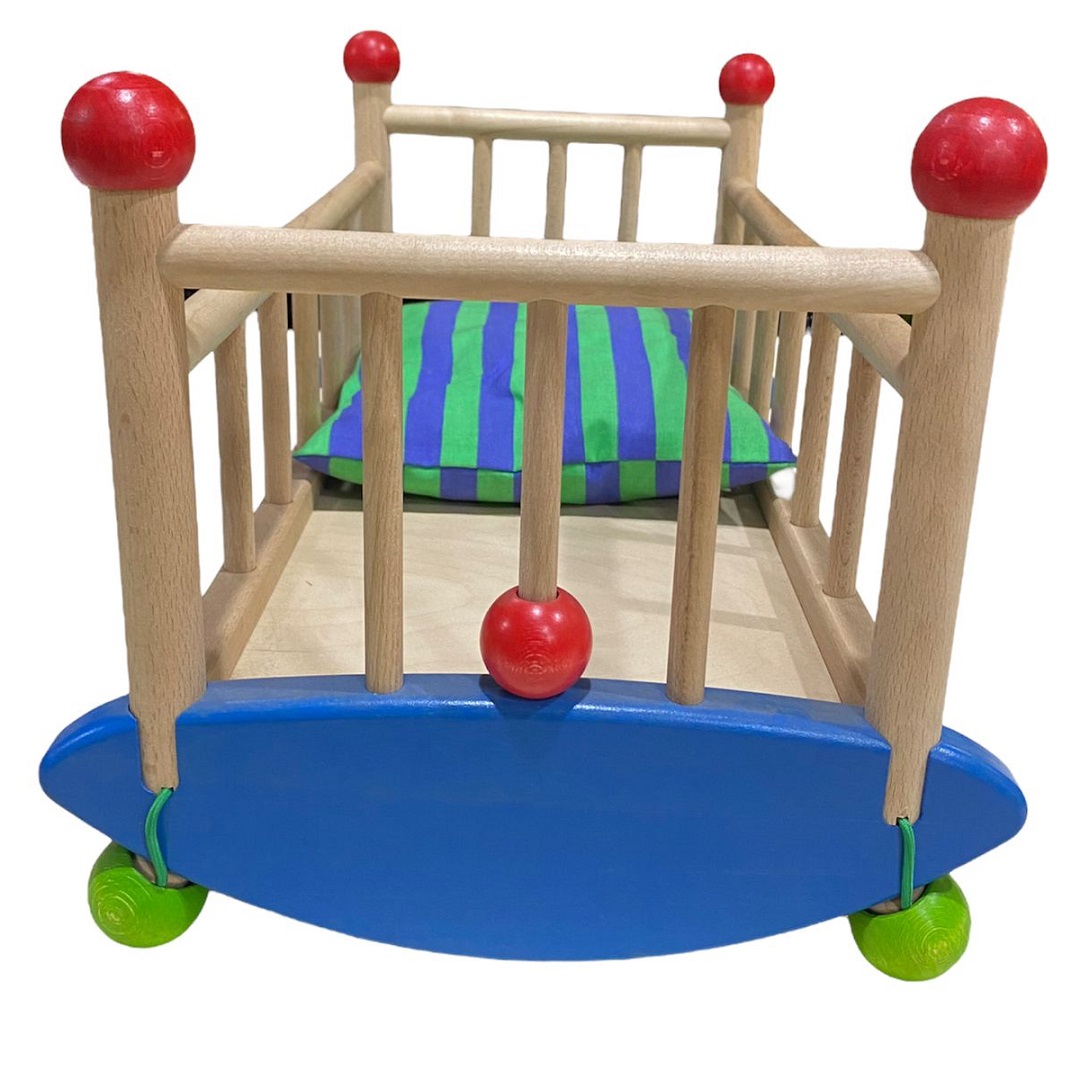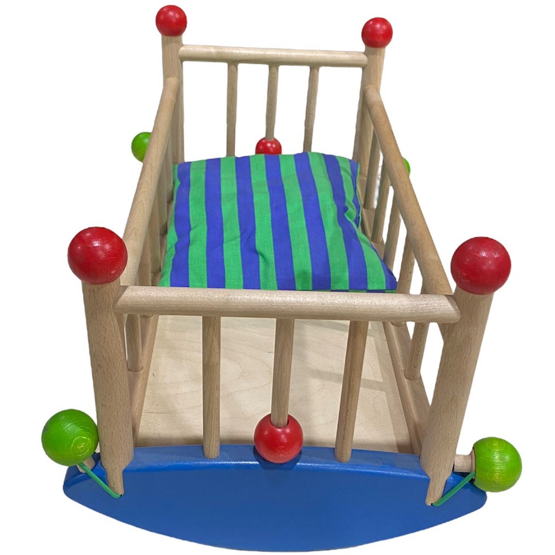 Ideal para fomentar el juego de roles creativo e imaginativo, y a su vez ayuda a estimular la mente de los niños a través del juego. Consta con pequeñas esferas en la parte inferior de la cuna para transformarla en mecedora o fija. Color natural, azul, rojo y verde. Material Madera. Dimensiones 44x21x23 cm. Presentación en bolsa.