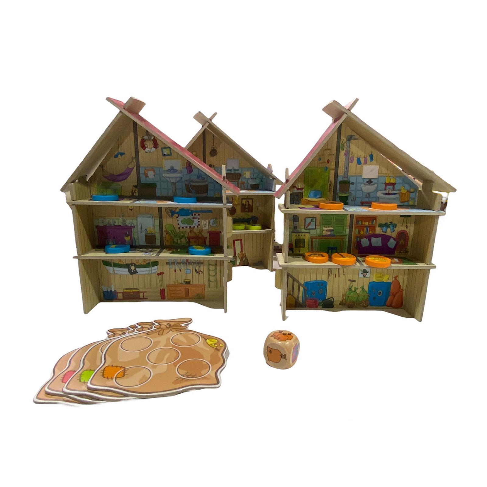 Desarrolla la orientación espacial, la memoria y el lenguaje. ¿Por qué está la salchicha en el dormitorio, la llave en el baño y el dinero en la cocina? Averigüé dónde los otros ladrones han escondido su botón haciendo preguntas inteligentes y pensando lógicamente. Solo siendo el primero en conseguir los cinco objetos de los otros ladrones podrás ganar la partida. Contenido: 4 casas de ladrones, cada una compuesta por 7 partes, 4 sacos de ladrones, 20 fichas (5 temas: vela, sombrero, llave, dinero, salchicha), 1 dado. Jugadores: 2-4. Edad recomendada desde los 4 años. Material cartón y madera. Dimensión de la pieza mas pequeña 2 x 2 cm. Presentación en caja.