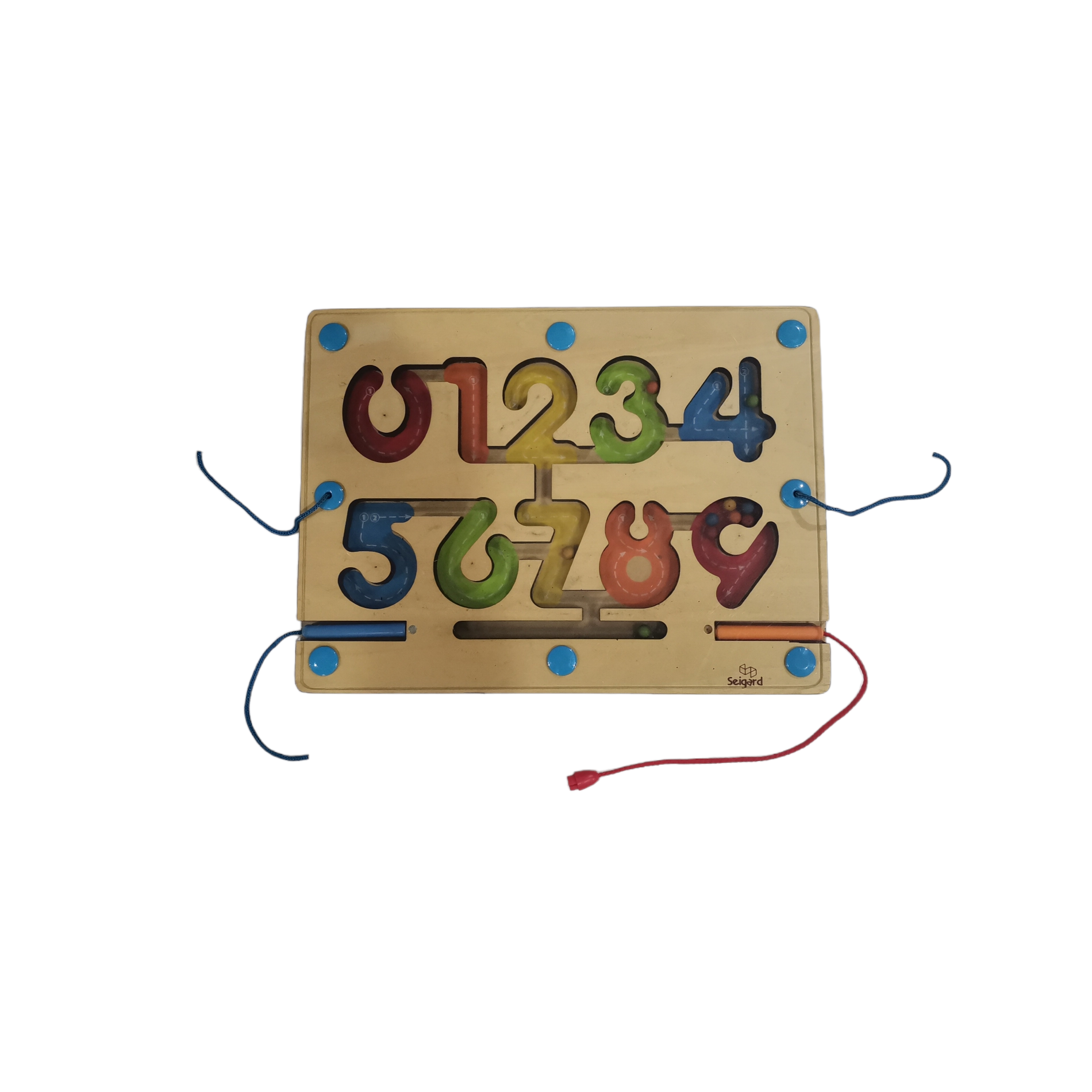 Laberinto magnético de números del 0 al 9. Se utiliza desplazando con los lápices las bolitas magnéticas por los números realizando el recorrido completo, para así poder aprender a hacer cada uno de esto. Material madera. Sus dimensiones son 30 x 22 x 1,5 cm.