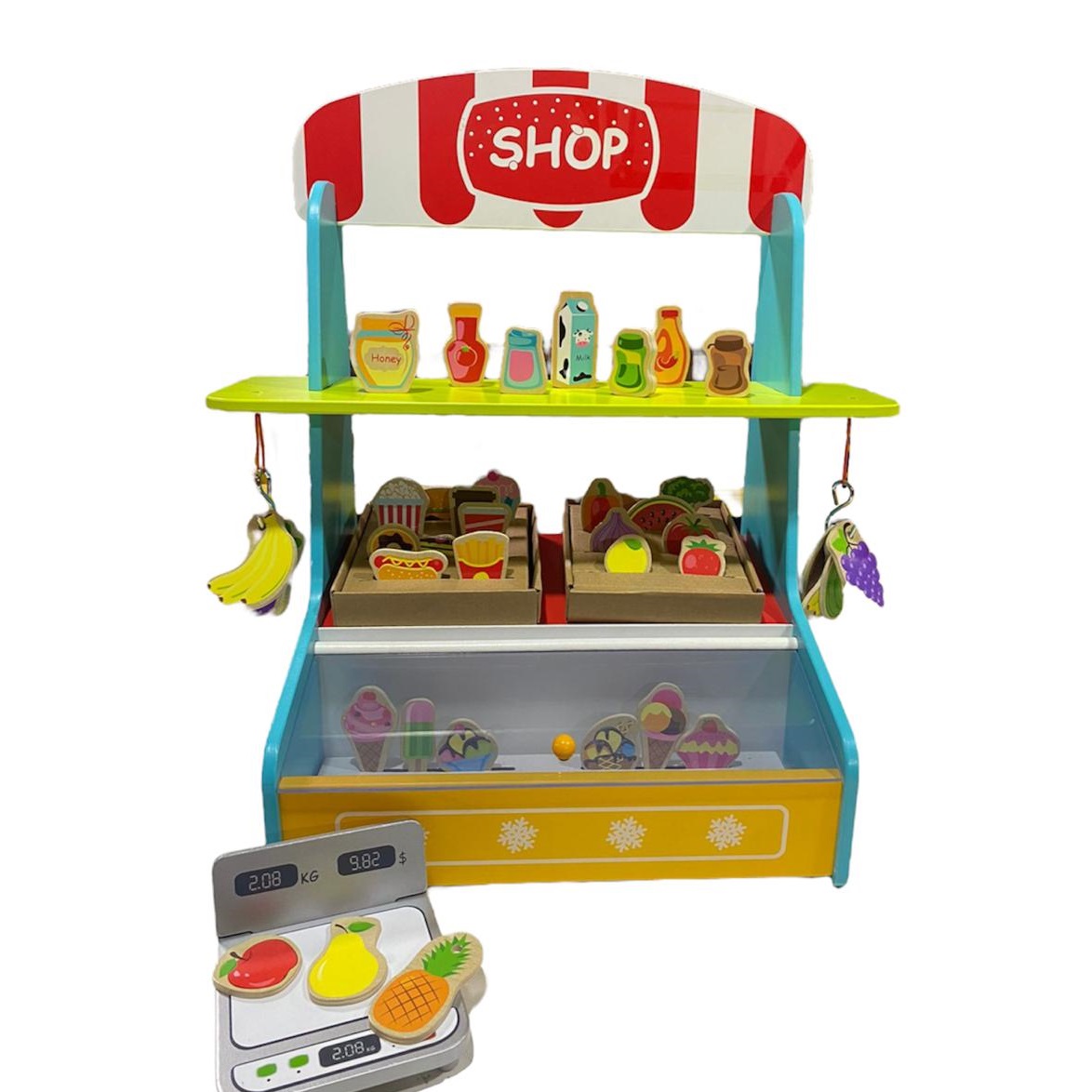 Con nuestro Mini Market nuestros pequeños podrán imaginar que son los mejores comerciantes de verduras del mundo. Viene con 42 piezas de diseños de frutas, verduras, pasteles y helados que hacen alusión de un comercio de venta de productos frescos. Material Madera. Multicolor. Dimensiones 30x50x54 cm. Presentación en bolsa.
