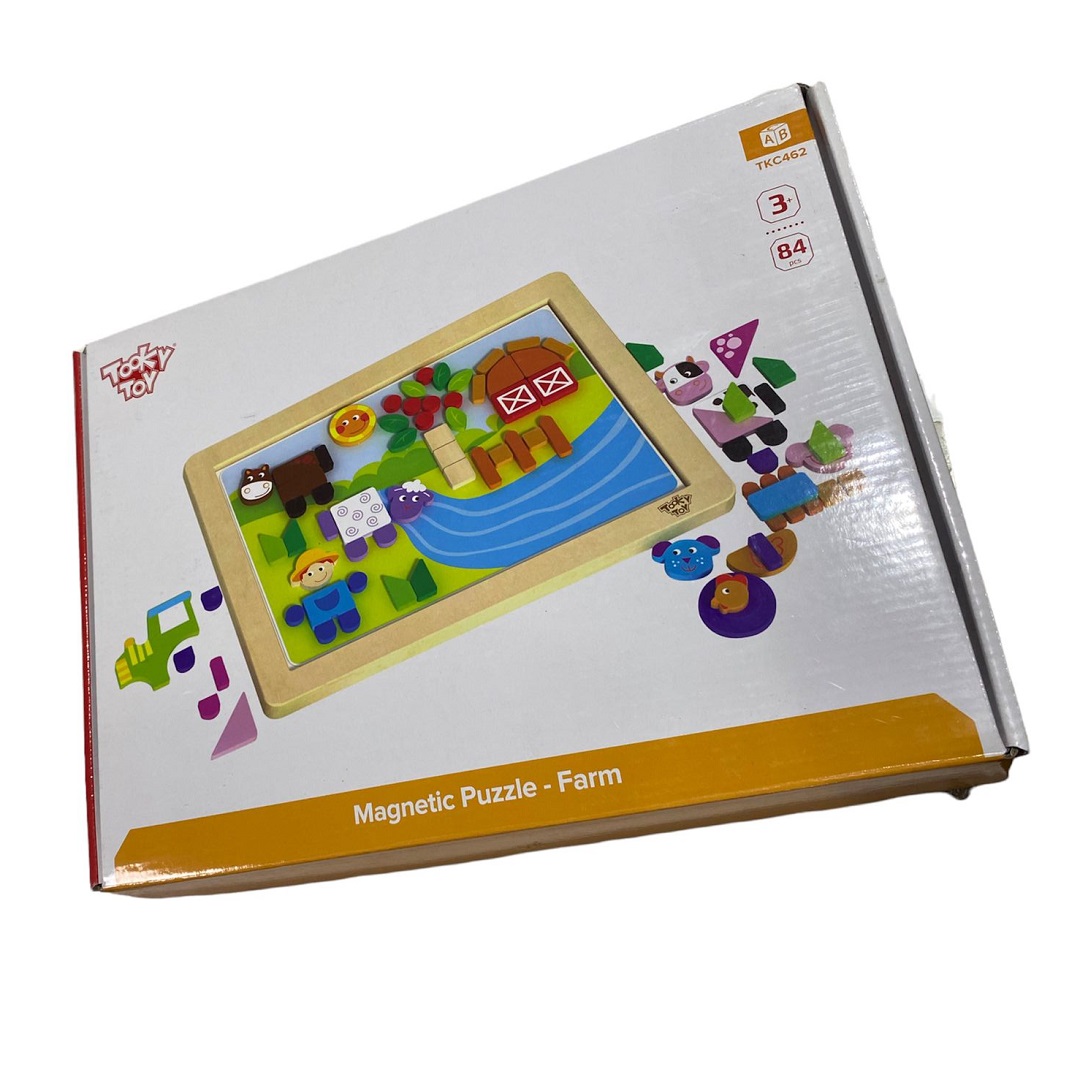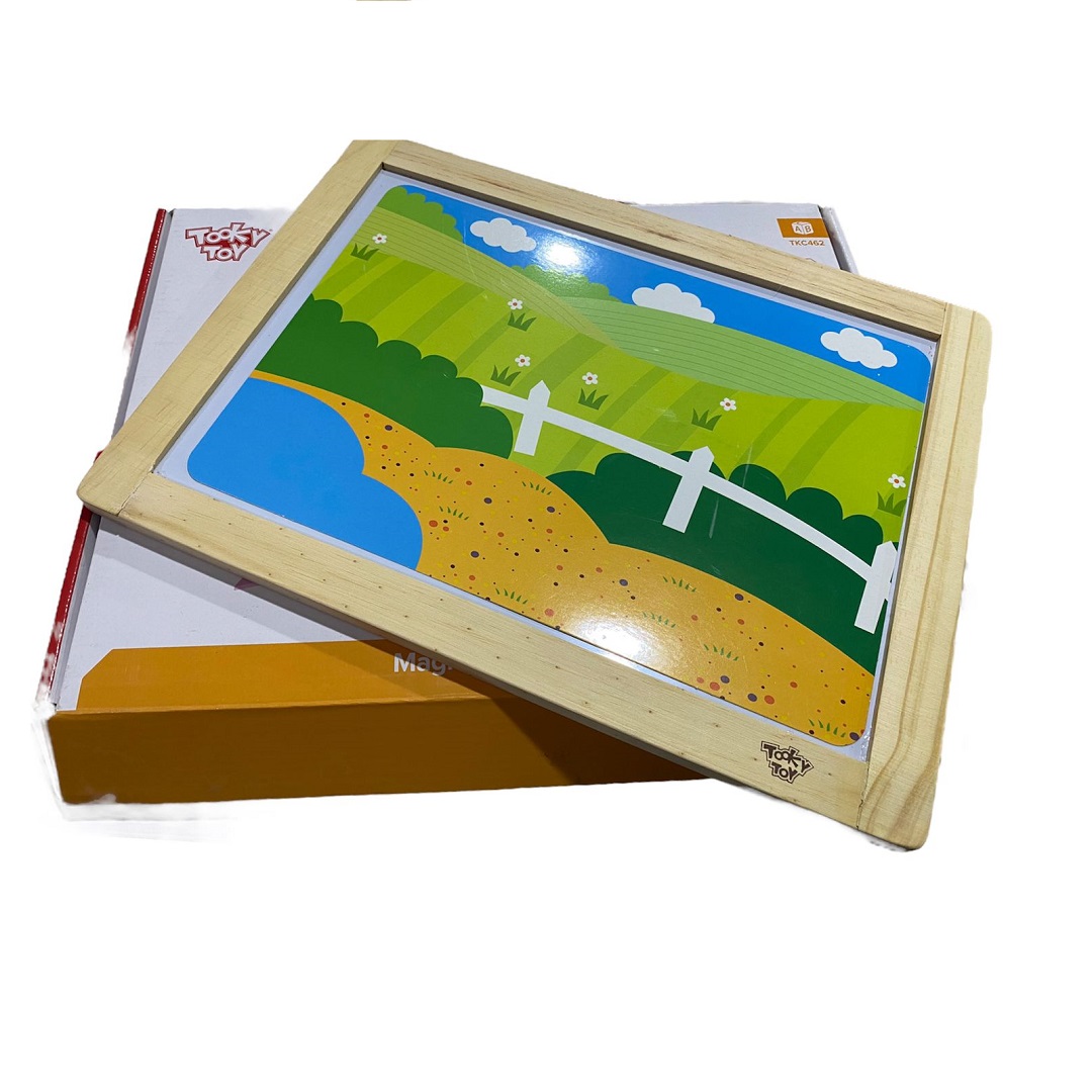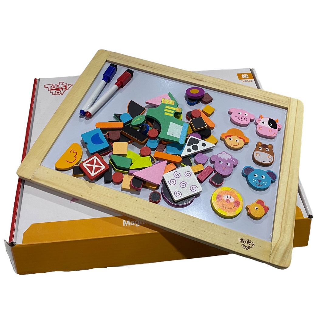 Pizarra magnética. diseño granja. Incluye 81 piezas de madera con base magnética en colores brillantes y formas variadas, 2 laminas de fondo intercambiables con paisajes por ambos lados y 2 plumones para pizarra. Estimula la creatividad infantil y potencia su desarrollo artístico temprano. Adecuado para niños desde los 3 años de edad. Material Madera atáxica. Medidas de la pizarra 36 x 27 x 1,5 cm. Presentación caja.