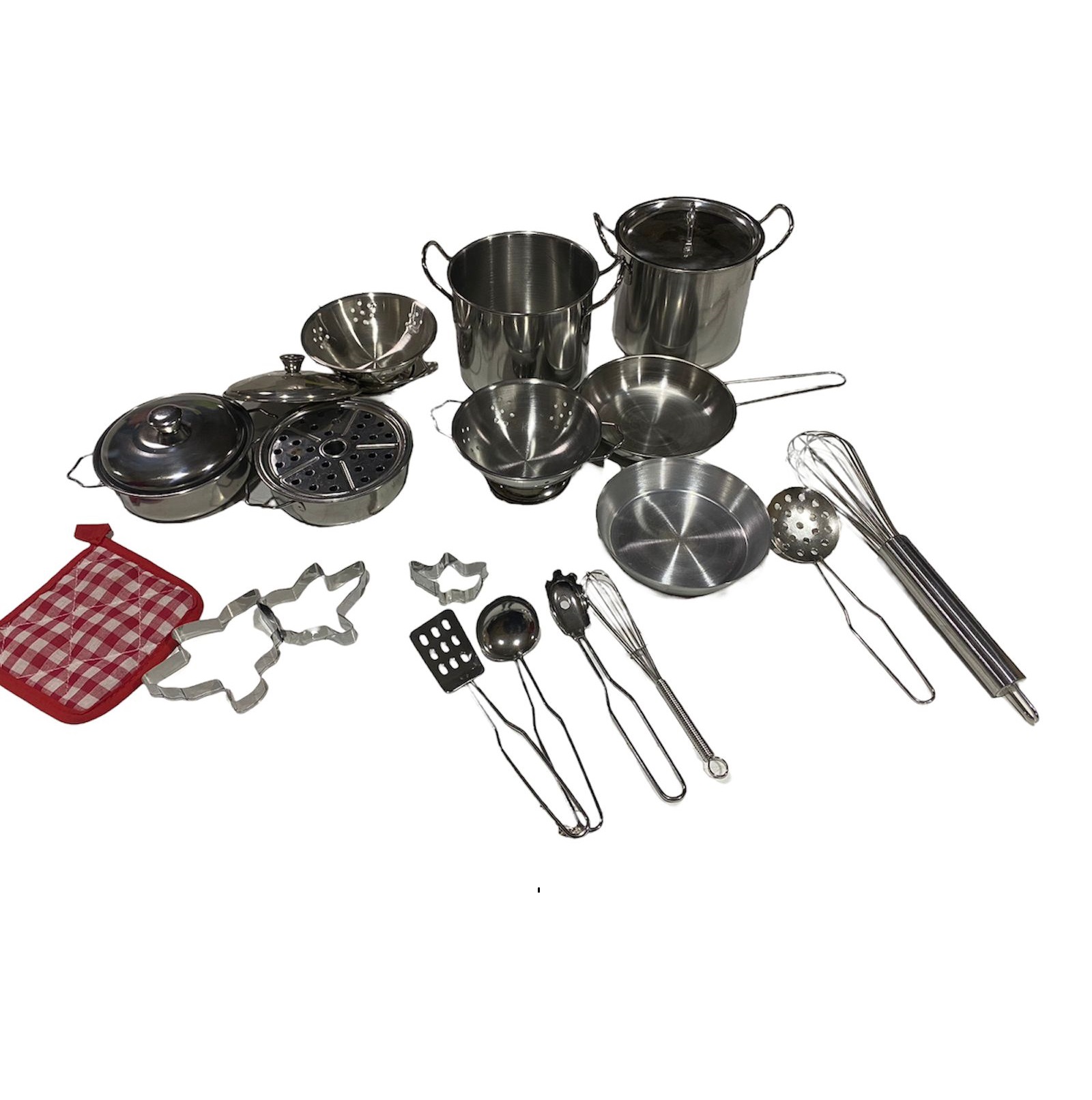 Permite a los niños desarrollar sus habilidades sociales mediante el juego de roles, la creatividad y la imaginación. Set compuesto por 18 piezas. Incluye tres moldes de galletas, dos ollas pequeñas, dos fondos ( a uno le falta la tapa), dos coladores, un sartén con mango, un molde de kuchen, dos batidores manuales, una espátula, una desnatadora de malla, un cucharon, una cuchara de pastas, un paño de cocina y un canasto de mimbre para su almacenamiento. Material acero inoxidable y mimbre. Dimensión pieza mas pequeña 5 x 3 cm. Dimensión pieza mas grande 21 x 5 cm. Presentación bolsa.